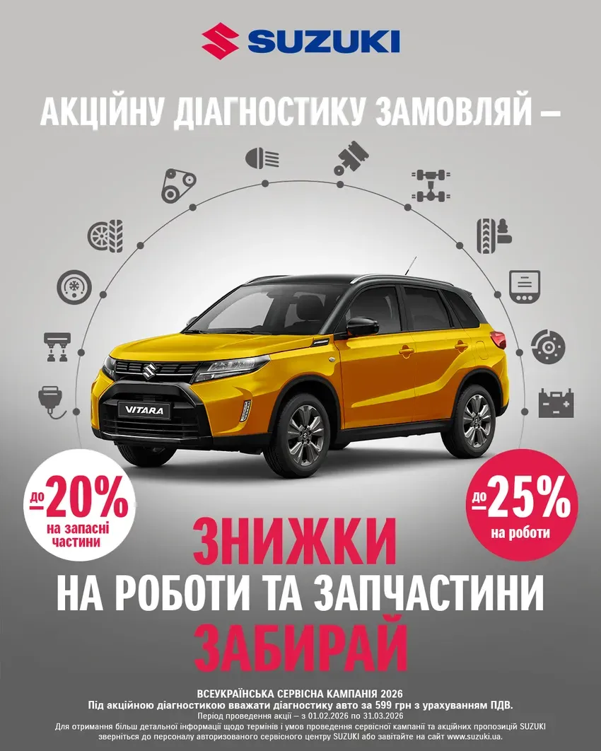 ТОВ "ТерКо Авто Моторс", офіційний дилер автомобілів SUZUKI в Тернопільському регіоні, оголошує про старт традиційної сервісної кампанії в офіційній дилерській мережі SUZUKI. В період з 02 лютого по 31 березня 2026 року власники автомобілів SUZUKI можуть провести комплексну діагностику* свого автомобіля всього за 599 гривень**, та за підсумком діагностики отримати до 25% знижки на роботи з обслуговування авто і до 20% на необхідні запасні частини***.